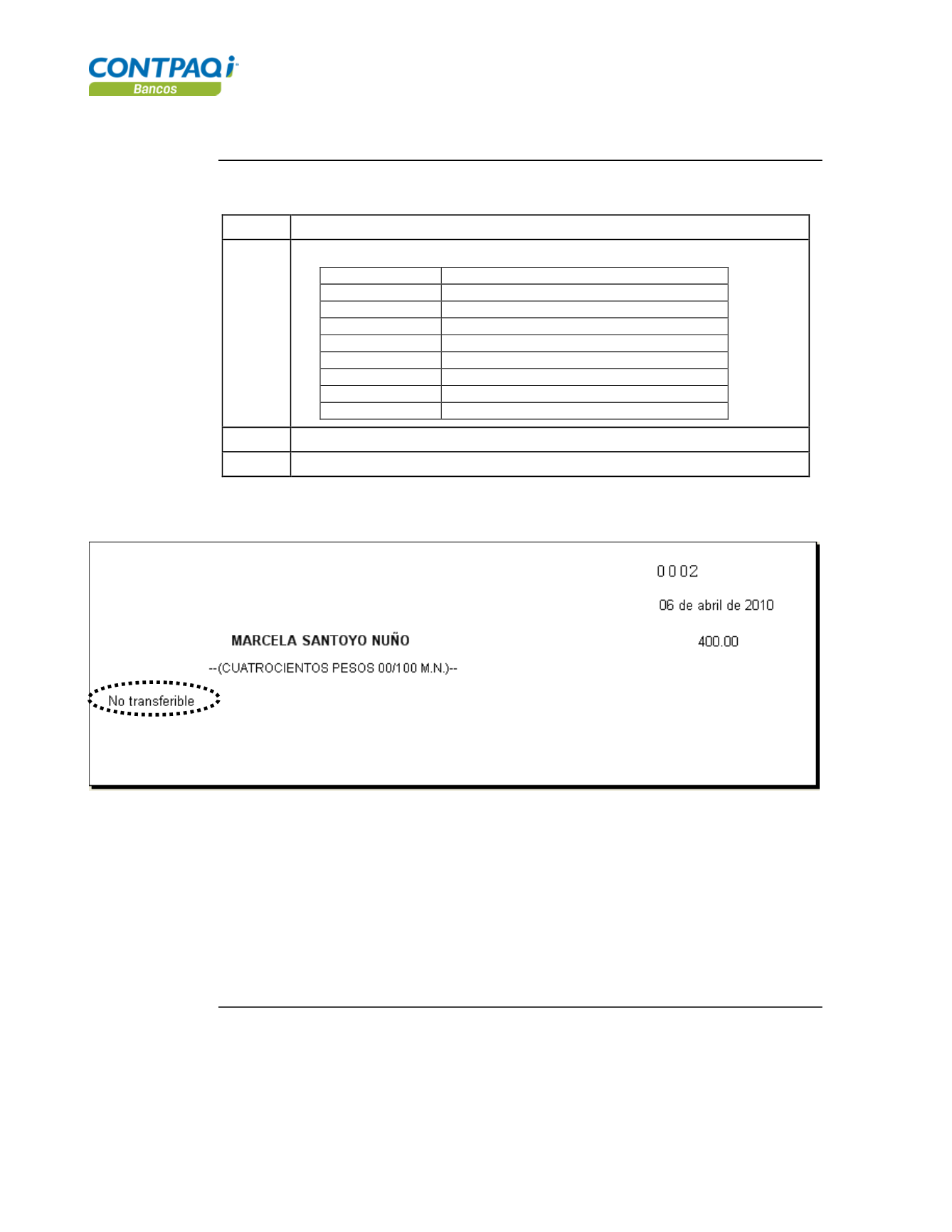 Solicita al instructor que imprima el último cheque para visualizar la leyenda para abono en